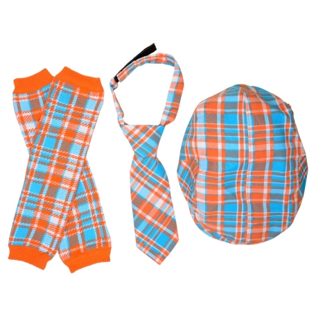 3 Pc Newsboy Hat, Tie & Leg Warmers Set - Turquoise & Tangerine