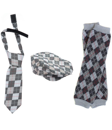 3 Pc Newsboy Hat, Tie & Leg Warmers Set - Gray Argyle