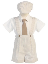 Striped Seersucker Suspendered Shorts Set - Khaki