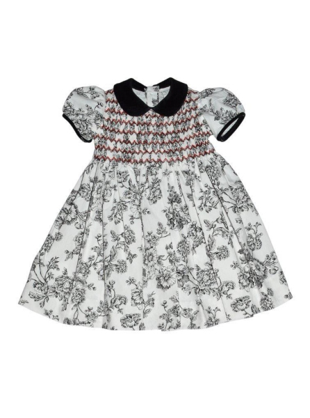 Beautiful 100% finely combed cotton special occasion dress in a black and white toile floral pattern with a smocked bodice that has accent red and black velvet collar. Back zipper. Machine wash cold. From high end manufacturer Carriage Boutique. Runs true to size.